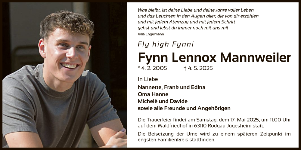 Hier finden Sie alle Traueranzeigen aus der Zeitung, die bisher für Fynn Lennox Mannweiler erschienen sind. Weitere Traueranzeigen, die in der Zeitung erscheinen, werden hier ebenfalls aufgelistet