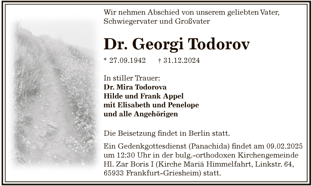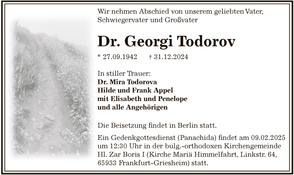 Hier finden Sie alle Traueranzeigen aus der Zeitung, die bisher für Georgi Todorov erschienen sind. Weitere Traueranzeigen, die in der Zeitung erscheinen, werden hier ebenfalls aufgelistet