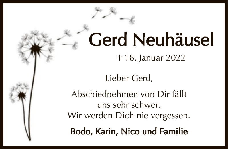 Hier finden Sie alle Traueranzeigen aus der Zeitung, die bisher für Gerd Neuhäusel erschienen sind. Weitere Traueranzeigen, die in der Zeitung erscheinen, werden hier ebenfalls aufgelistet