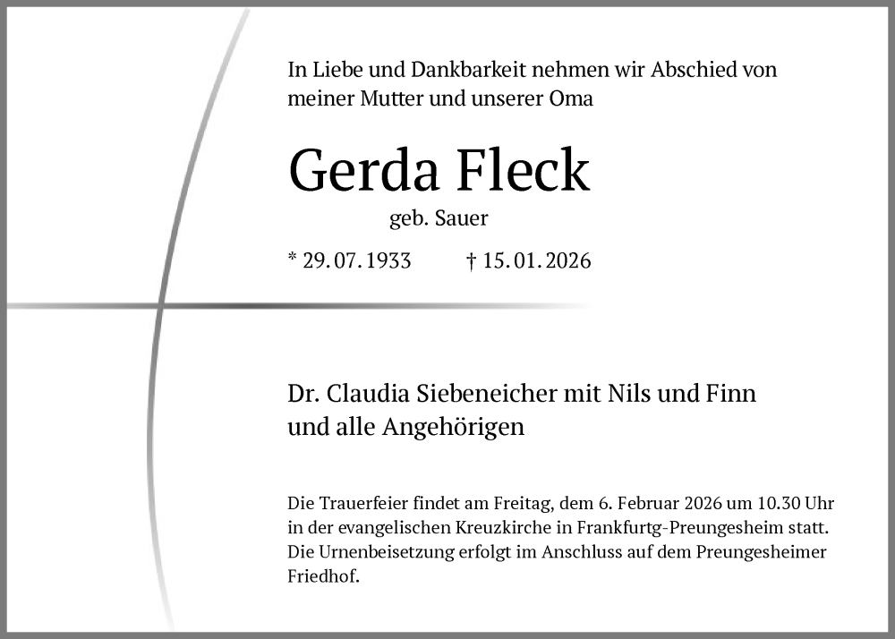 Hier finden Sie alle Traueranzeigen aus der Zeitung, die bisher für Gerda Fleck erschienen sind. Weitere Traueranzeigen, die in der Zeitung erscheinen, werden hier ebenfalls aufgelistet