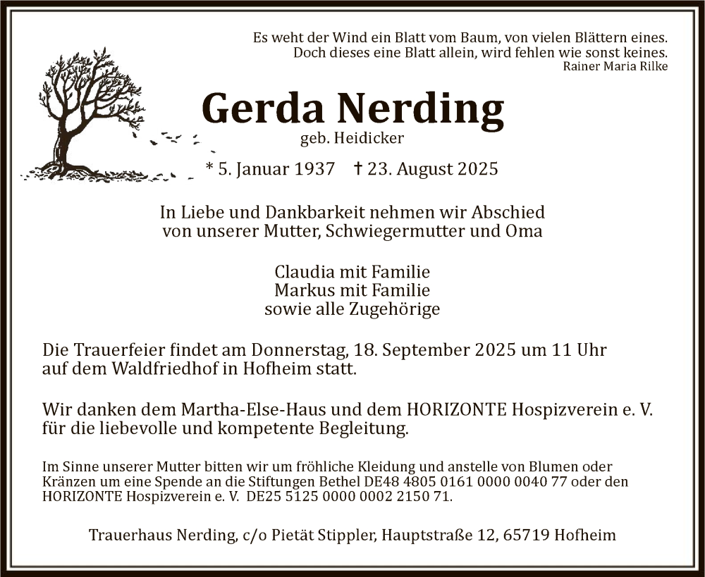 Hier finden Sie alle Traueranzeigen aus der Zeitung, die bisher für Gerda Nerding erschienen sind. Weitere Traueranzeigen, die in der Zeitung erscheinen, werden hier ebenfalls aufgelistet
