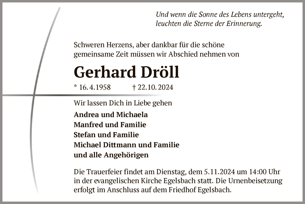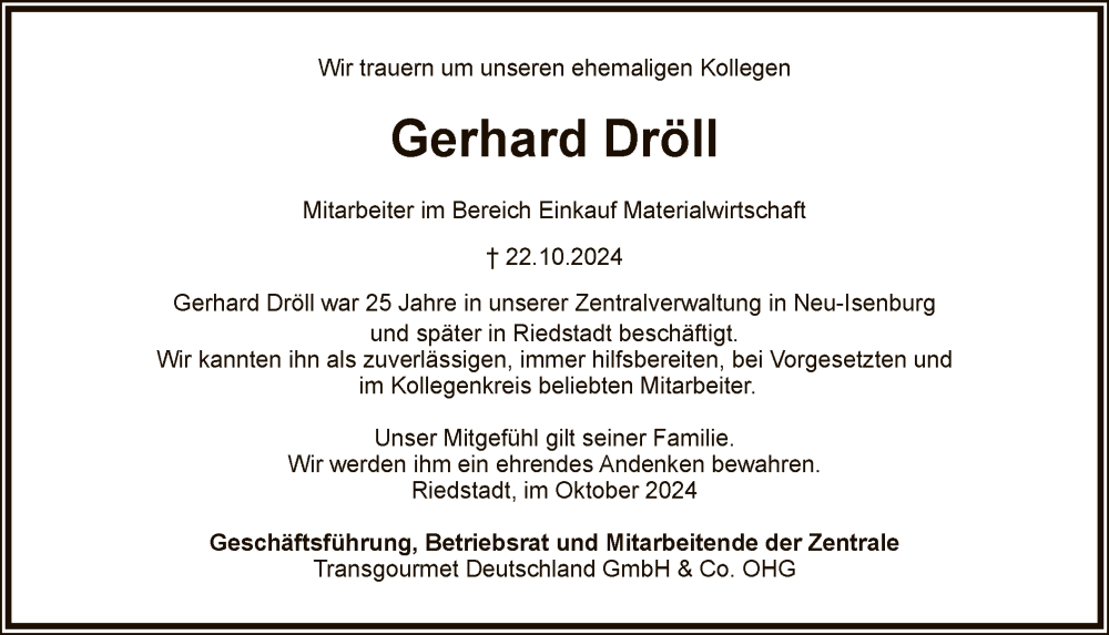 Hier finden Sie alle Traueranzeigen aus der Zeitung, die bisher für Gerhard Dröll erschienen sind. Weitere Traueranzeigen, die in der Zeitung erscheinen, werden hier ebenfalls aufgelistet