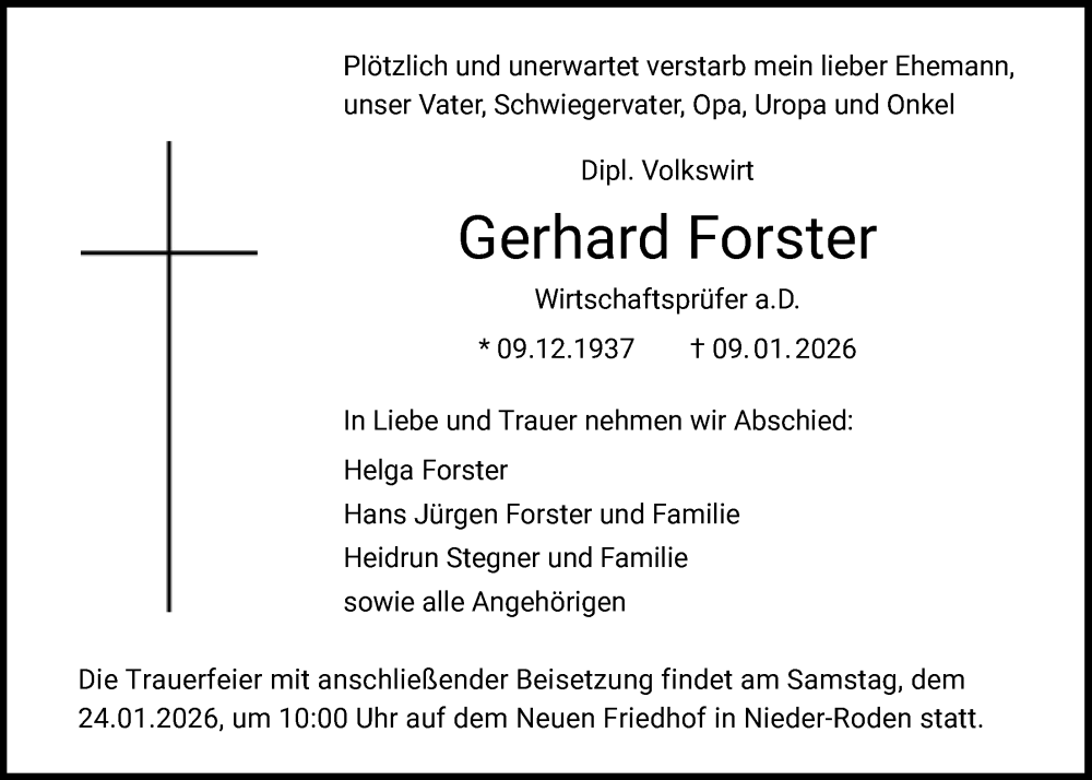 Hier finden Sie alle Traueranzeigen aus der Zeitung, die bisher für Gerhard Forster erschienen sind. Weitere Traueranzeigen, die in der Zeitung erscheinen, werden hier ebenfalls aufgelistet