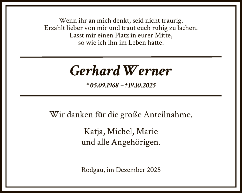 Hier finden Sie alle Traueranzeigen aus der Zeitung, die bisher für Gerhard Werner erschienen sind. Weitere Traueranzeigen, die in der Zeitung erscheinen, werden hier ebenfalls aufgelistet