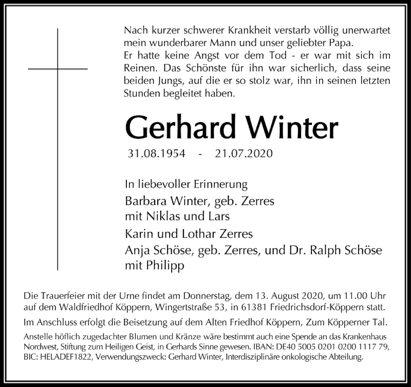Hier finden Sie alle Traueranzeigen aus der Zeitung, die bisher für Gerhard Winter erschienen sind. Weitere Traueranzeigen, die in der Zeitung erscheinen, werden hier ebenfalls aufgelistet