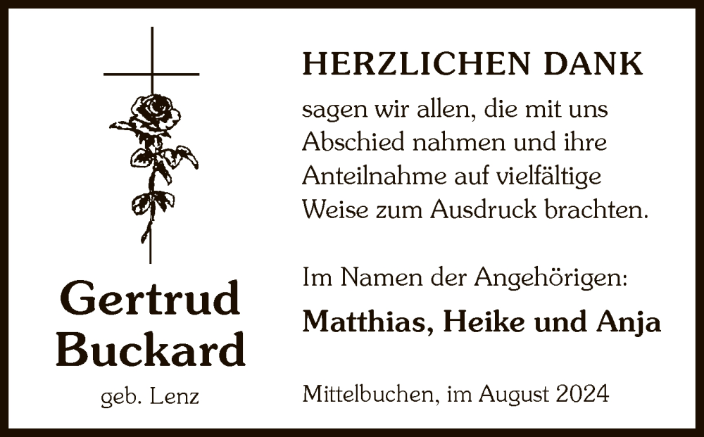 Hier finden Sie alle Traueranzeigen aus der Zeitung, die bisher für Gertrud Buckard erschienen sind. Weitere Traueranzeigen, die in der Zeitung erscheinen, werden hier ebenfalls aufgelistet