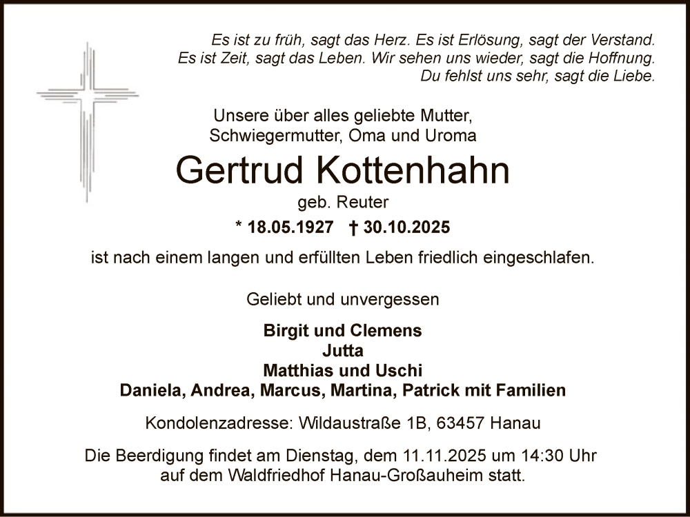 Hier finden Sie alle Traueranzeigen aus der Zeitung, die bisher für Gertrud Kottenhahn erschienen sind. Weitere Traueranzeigen, die in der Zeitung erscheinen, werden hier ebenfalls aufgelistet