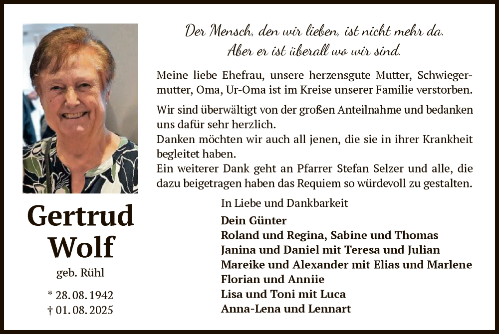 Hier finden Sie alle Traueranzeigen aus der Zeitung, die bisher für Gertrud Wolf erschienen sind. Weitere Traueranzeigen, die in der Zeitung erscheinen, werden hier ebenfalls aufgelistet