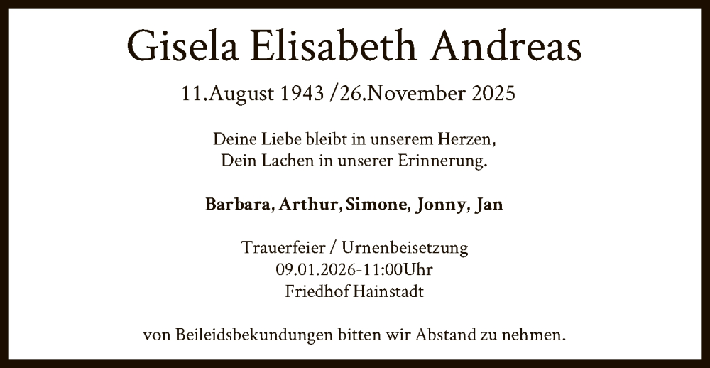 Hier finden Sie alle Traueranzeigen aus der Zeitung, die bisher für Gisela Elisabeth Andreas erschienen sind. Weitere Traueranzeigen, die in der Zeitung erscheinen, werden hier ebenfalls aufgelistet