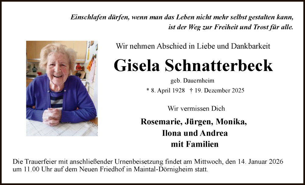 Hier finden Sie alle Traueranzeigen aus der Zeitung, die bisher für Gisela Schnatterbeck erschienen sind. Weitere Traueranzeigen, die in der Zeitung erscheinen, werden hier ebenfalls aufgelistet
