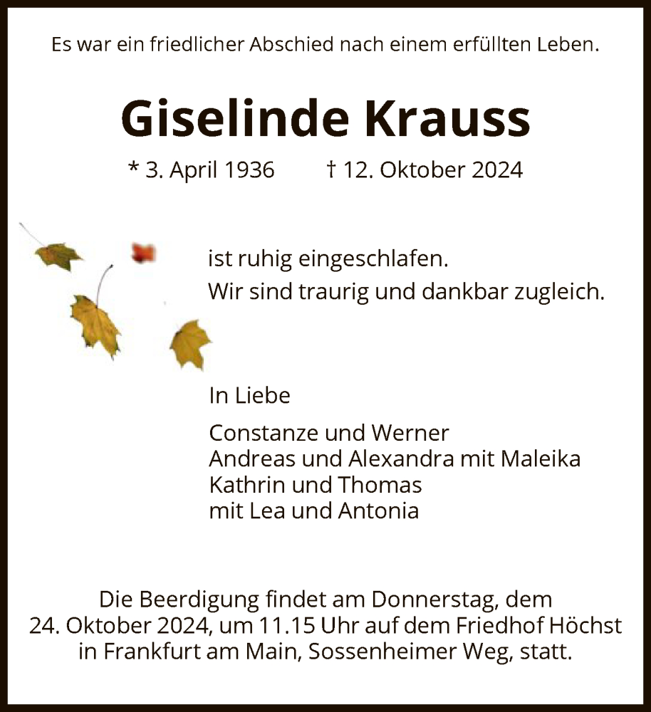Hier finden Sie alle Traueranzeigen aus der Zeitung, die bisher für Giselinde Krauss erschienen sind. Weitere Traueranzeigen, die in der Zeitung erscheinen, werden hier ebenfalls aufgelistet