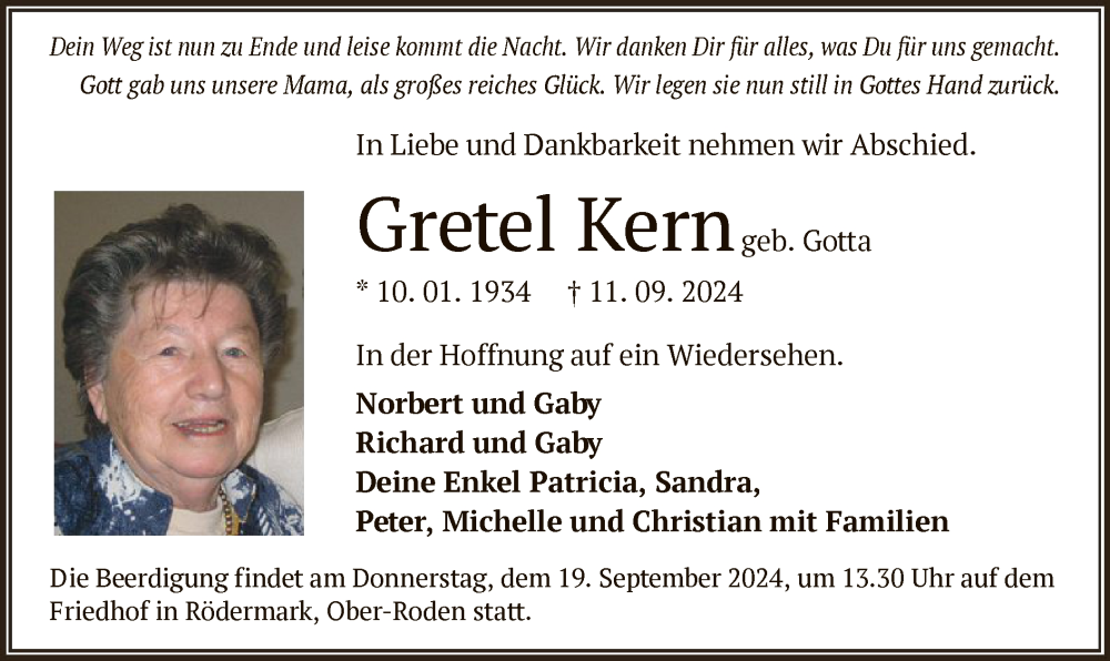 Hier finden Sie alle Traueranzeigen aus der Zeitung, die bisher für Gretel Kern erschienen sind. Weitere Traueranzeigen, die in der Zeitung erscheinen, werden hier ebenfalls aufgelistet