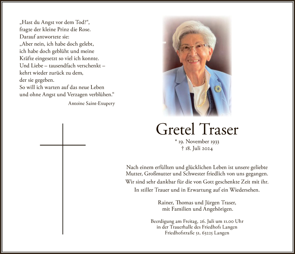 Hier finden Sie alle Traueranzeigen aus der Zeitung, die bisher für Gretel Traser erschienen sind. Weitere Traueranzeigen, die in der Zeitung erscheinen, werden hier ebenfalls aufgelistet