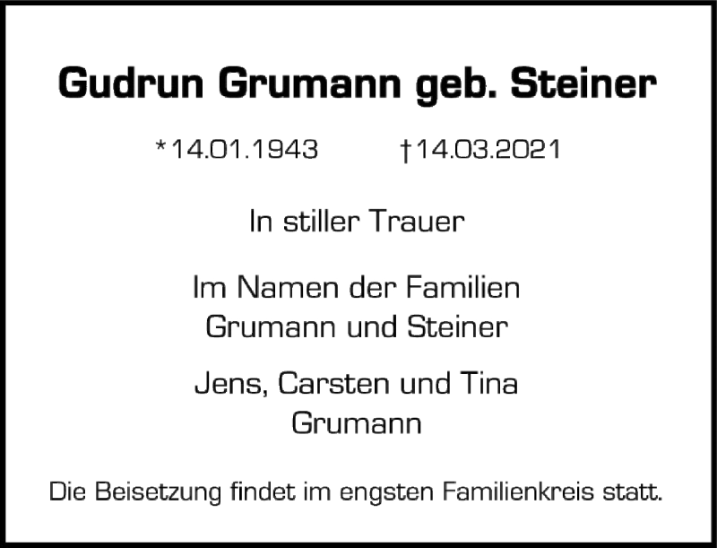 Hier finden Sie alle Traueranzeigen aus der Zeitung, die bisher für Gudrun Grumann erschienen sind. Weitere Traueranzeigen, die in der Zeitung erscheinen, werden hier ebenfalls aufgelistet