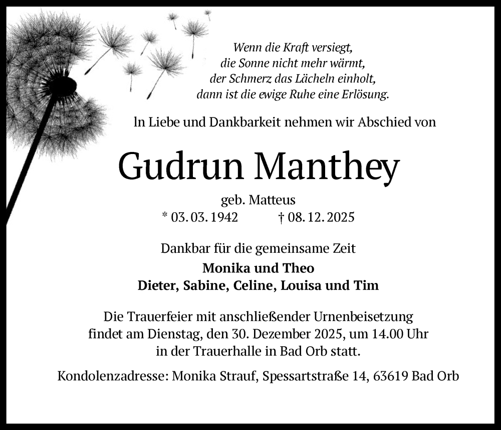 Hier finden Sie alle Traueranzeigen aus der Zeitung, die bisher für Gudrun Manthey erschienen sind. Weitere Traueranzeigen, die in der Zeitung erscheinen, werden hier ebenfalls aufgelistet