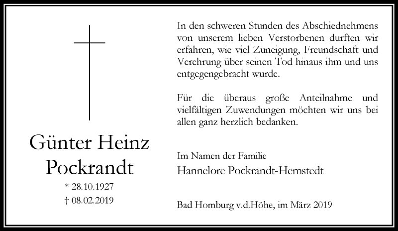 Hier finden Sie alle Traueranzeigen aus der Zeitung, die bisher für Günter Heinz Pockrandt erschienen sind. Weitere Traueranzeigen, die in der Zeitung erscheinen, werden hier ebenfalls aufgelistet