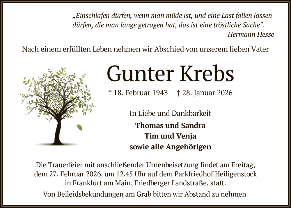 Hier finden Sie alle Traueranzeigen aus der Zeitung, die bisher für Gunter Krebs erschienen sind. Weitere Traueranzeigen, die in der Zeitung erscheinen, werden hier ebenfalls aufgelistet