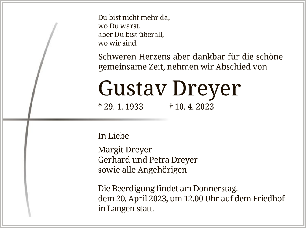 Hier finden Sie alle Traueranzeigen aus der Zeitung, die bisher für Gustav Dreyer erschienen sind. Weitere Traueranzeigen, die in der Zeitung erscheinen, werden hier ebenfalls aufgelistet