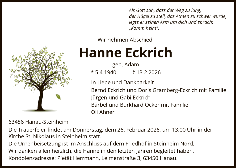 Hier finden Sie alle Traueranzeigen aus der Zeitung, die bisher für Hanne Eckrich erschienen sind. Weitere Traueranzeigen, die in der Zeitung erscheinen, werden hier ebenfalls aufgelistet