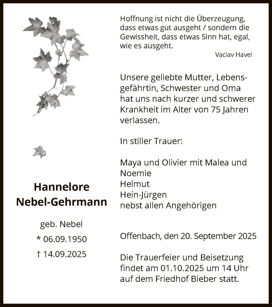 Hier finden Sie alle Traueranzeigen aus der Zeitung, die bisher für Hannelore Nebel-Gehrmann erschienen sind. Weitere Traueranzeigen, die in der Zeitung erscheinen, werden hier ebenfalls aufgelistet