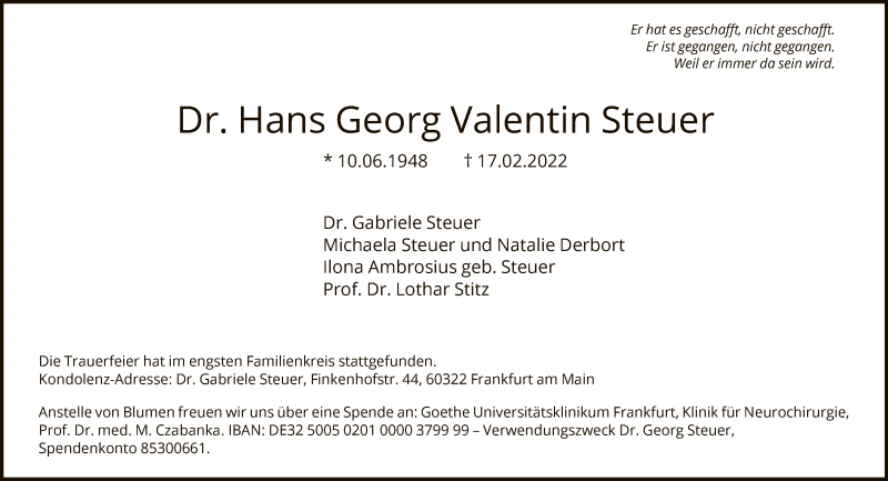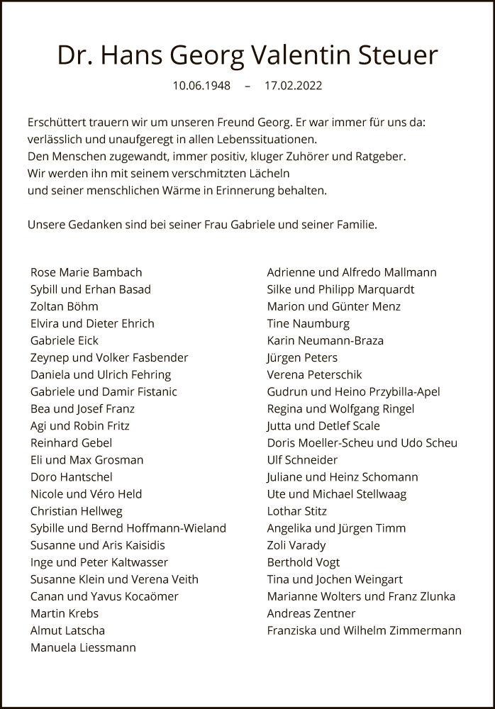 Hier finden Sie alle Traueranzeigen aus der Zeitung, die bisher für Hans Georg Valentin Steuer erschienen sind. Weitere Traueranzeigen, die in der Zeitung erscheinen, werden hier ebenfalls aufgelistet