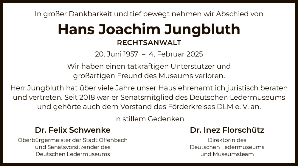 Hier finden Sie alle Traueranzeigen aus der Zeitung, die bisher für Hans Joachim Jungbluth erschienen sind. Weitere Traueranzeigen, die in der Zeitung erscheinen, werden hier ebenfalls aufgelistet