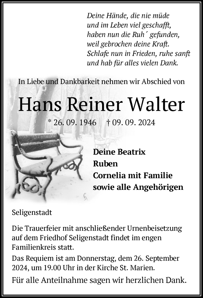 Hier finden Sie alle Traueranzeigen aus der Zeitung, die bisher für Hans Reiner Walter erschienen sind. Weitere Traueranzeigen, die in der Zeitung erscheinen, werden hier ebenfalls aufgelistet