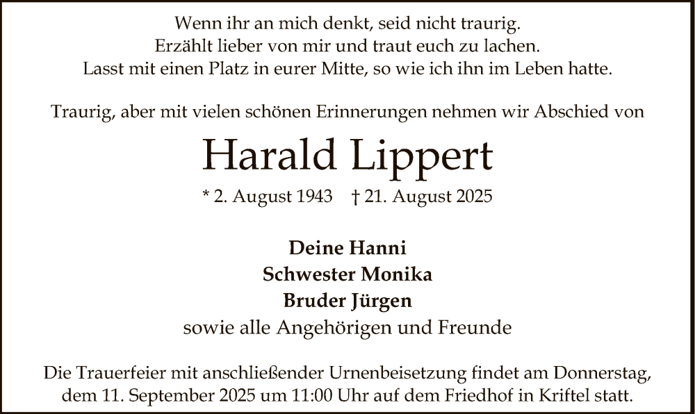 Hier finden Sie alle Traueranzeigen aus der Zeitung, die bisher für Harald Lippert erschienen sind. Weitere Traueranzeigen, die in der Zeitung erscheinen, werden hier ebenfalls aufgelistet