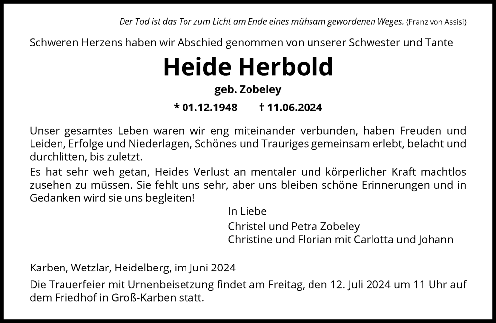 Hier finden Sie alle Traueranzeigen aus der Zeitung, die bisher für Heide Herbold erschienen sind. Weitere Traueranzeigen, die in der Zeitung erscheinen, werden hier ebenfalls aufgelistet