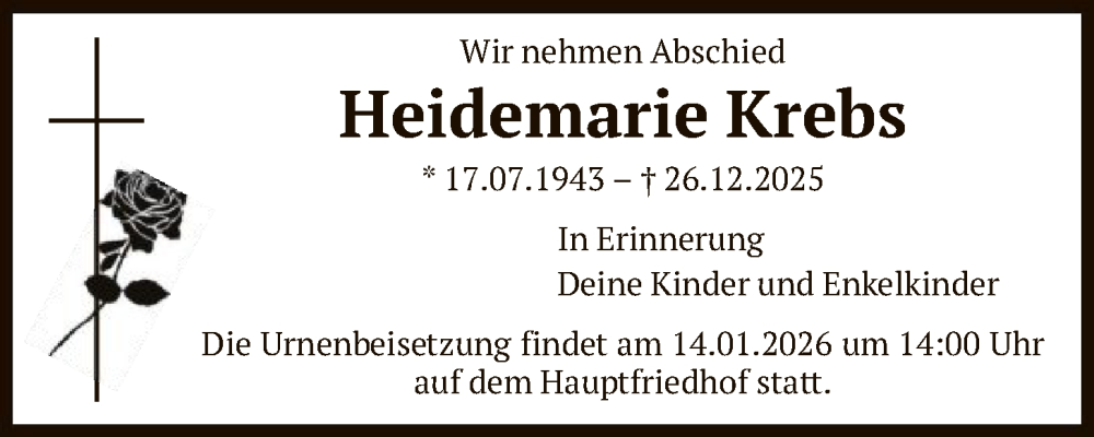 Hier finden Sie alle Traueranzeigen aus der Zeitung, die bisher für Heidemarie Krebs erschienen sind. Weitere Traueranzeigen, die in der Zeitung erscheinen, werden hier ebenfalls aufgelistet
