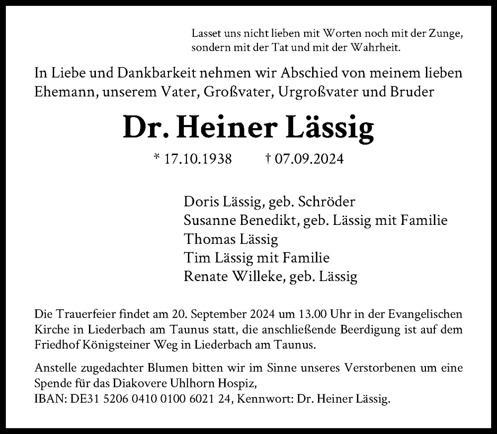 Hier finden Sie alle Traueranzeigen aus der Zeitung, die bisher für Heiner Lässig erschienen sind. Weitere Traueranzeigen, die in der Zeitung erscheinen, werden hier ebenfalls aufgelistet