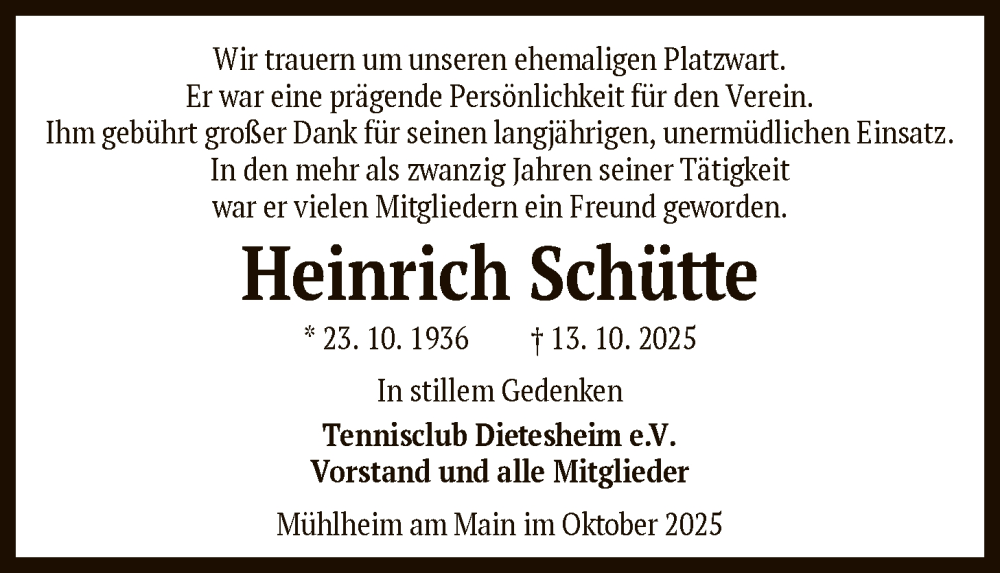 Hier finden Sie alle Traueranzeigen aus der Zeitung, die bisher für Heinrich Schütte erschienen sind. Weitere Traueranzeigen, die in der Zeitung erscheinen, werden hier ebenfalls aufgelistet