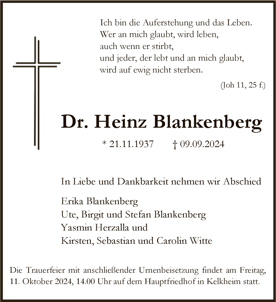 Hier finden Sie alle Traueranzeigen aus der Zeitung, die bisher für Heinz Blankenberg erschienen sind. Weitere Traueranzeigen, die in der Zeitung erscheinen, werden hier ebenfalls aufgelistet