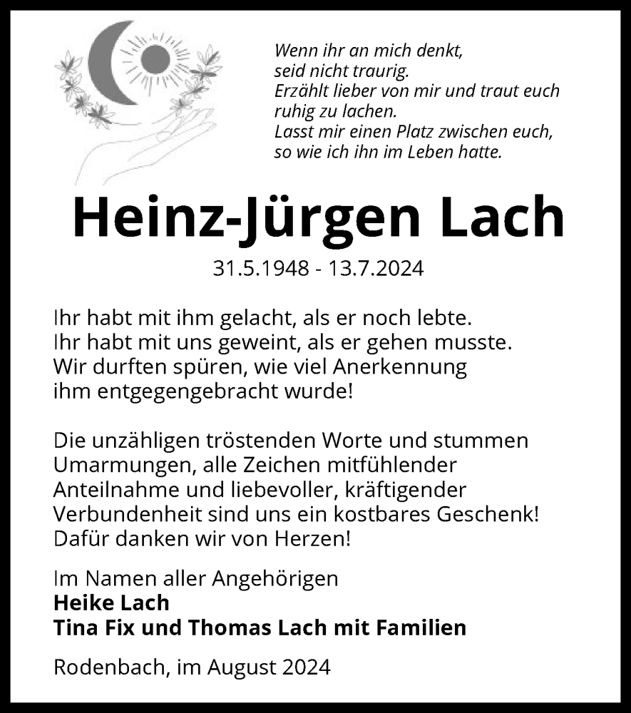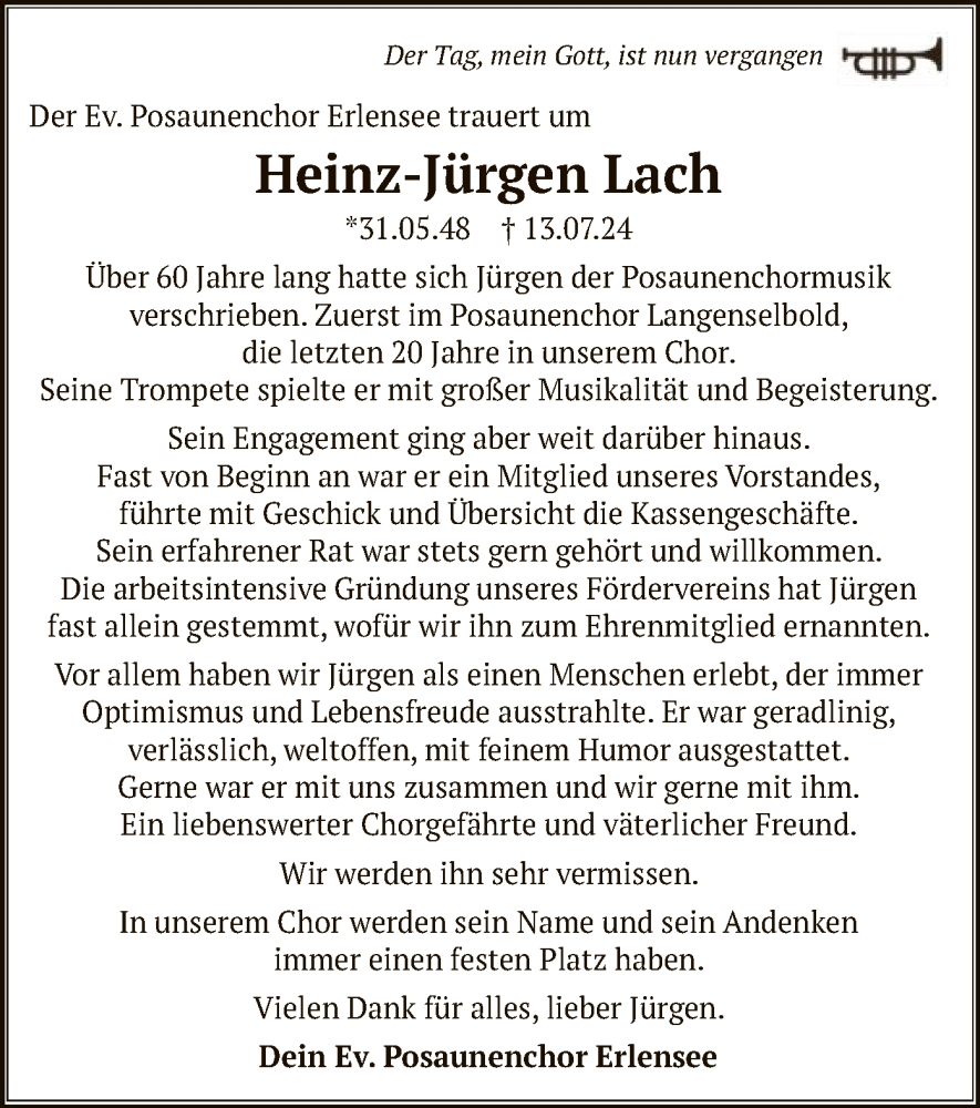 Hier finden Sie alle Traueranzeigen aus der Zeitung, die bisher für Heinz-Jürgen Lach erschienen sind. Weitere Traueranzeigen, die in der Zeitung erscheinen, werden hier ebenfalls aufgelistet