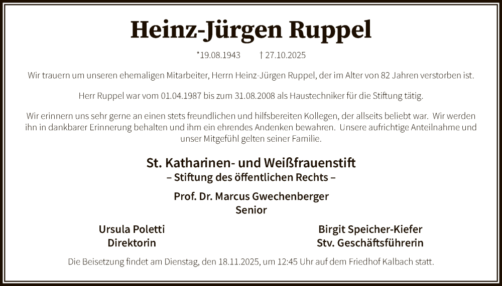 Hier finden Sie alle Traueranzeigen aus der Zeitung, die bisher für Heinz-Jürgen Ruppel erschienen sind. Weitere Traueranzeigen, die in der Zeitung erscheinen, werden hier ebenfalls aufgelistet