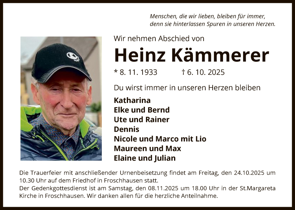 Hier finden Sie alle Traueranzeigen aus der Zeitung, die bisher für Heinz Kämmerer erschienen sind. Weitere Traueranzeigen, die in der Zeitung erscheinen, werden hier ebenfalls aufgelistet