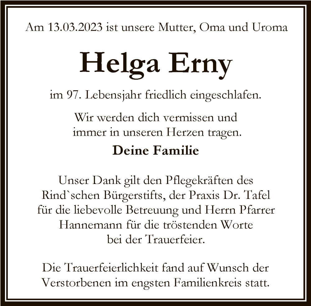 Hier finden Sie alle Traueranzeigen aus der Zeitung, die bisher für Helga Erny erschienen sind. Weitere Traueranzeigen, die in der Zeitung erscheinen, werden hier ebenfalls aufgelistet