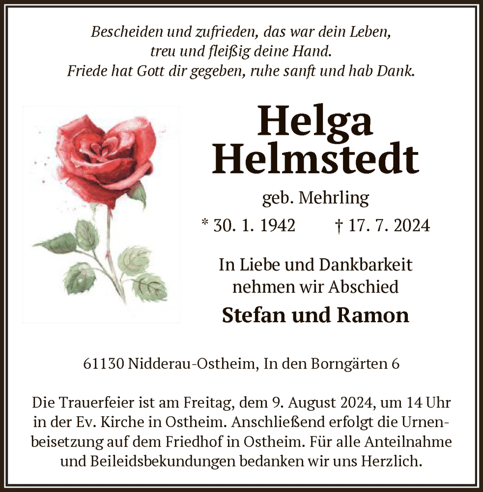 Hier finden Sie alle Traueranzeigen aus der Zeitung, die bisher für Helga Helmstedt erschienen sind. Weitere Traueranzeigen, die in der Zeitung erscheinen, werden hier ebenfalls aufgelistet