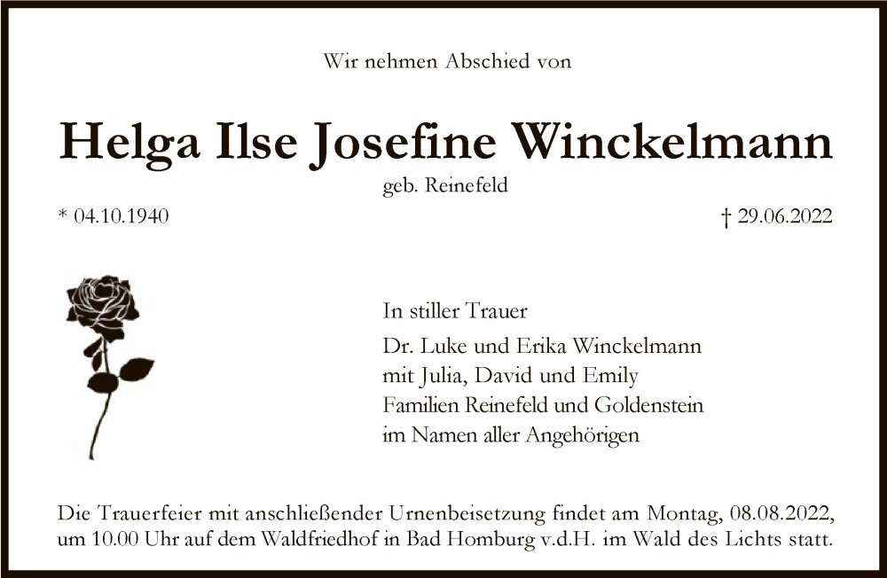 Hier finden Sie alle Traueranzeigen aus der Zeitung, die bisher für Helga Ilse Josefine Winckelmann erschienen sind. Weitere Traueranzeigen, die in der Zeitung erscheinen, werden hier ebenfalls aufgelistet