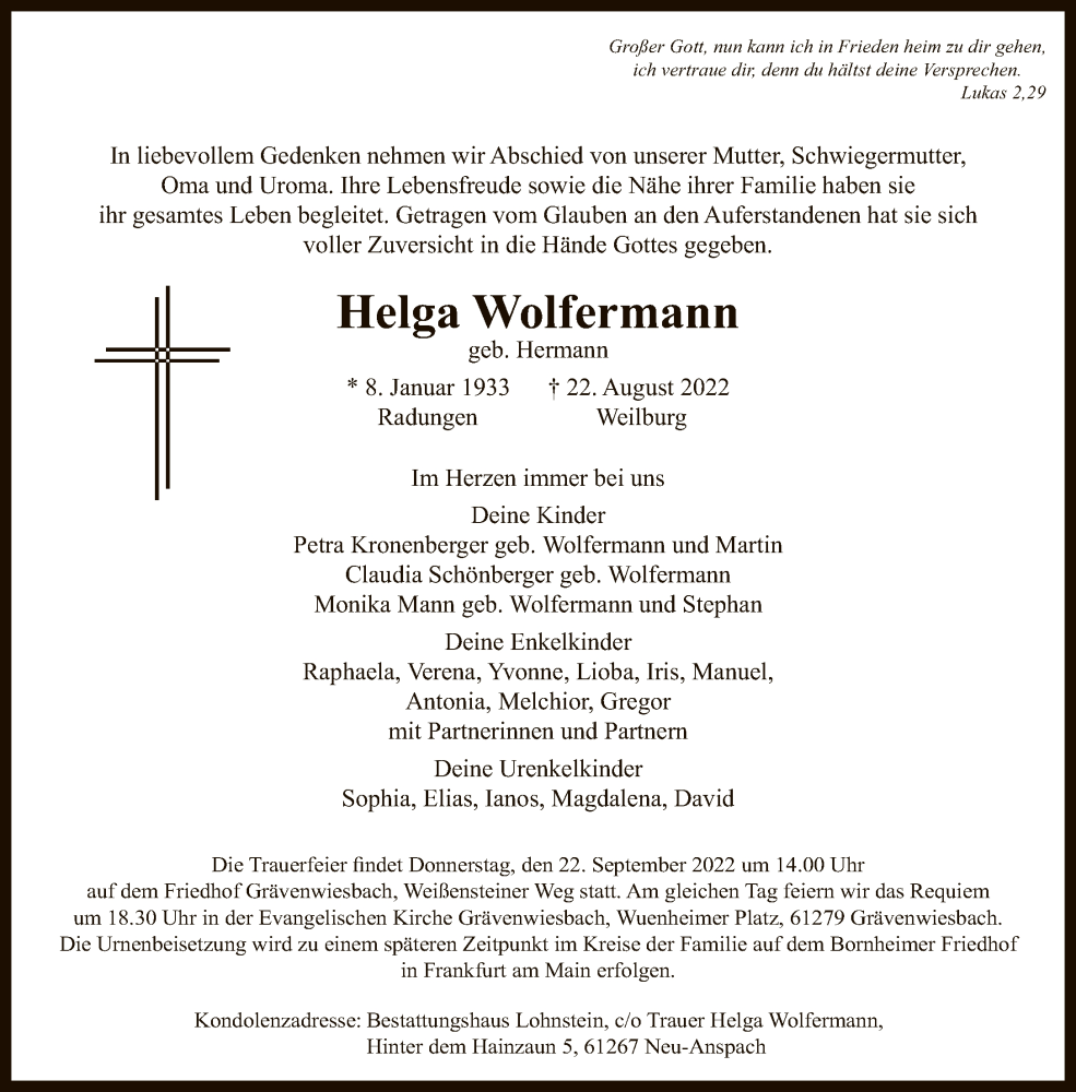 Hier finden Sie alle Traueranzeigen aus der Zeitung, die bisher für Helga Wolfermann erschienen sind. Weitere Traueranzeigen, die in der Zeitung erscheinen, werden hier ebenfalls aufgelistet
