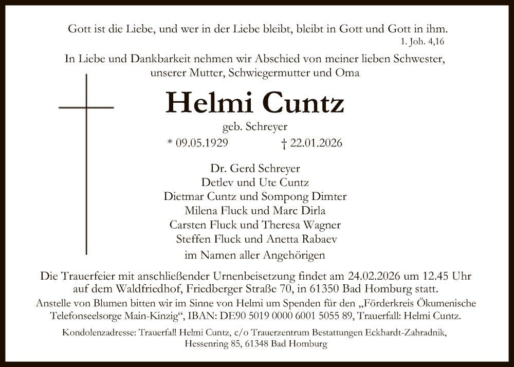 Hier finden Sie alle Traueranzeigen aus der Zeitung, die bisher für Helmi Cuntz erschienen sind. Weitere Traueranzeigen, die in der Zeitung erscheinen, werden hier ebenfalls aufgelistet