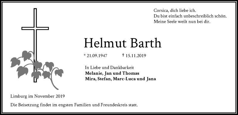 Hier finden Sie alle Traueranzeigen aus der Zeitung, die bisher für Helmut Barth erschienen sind. Weitere Traueranzeigen, die in der Zeitung erscheinen, werden hier ebenfalls aufgelistet
