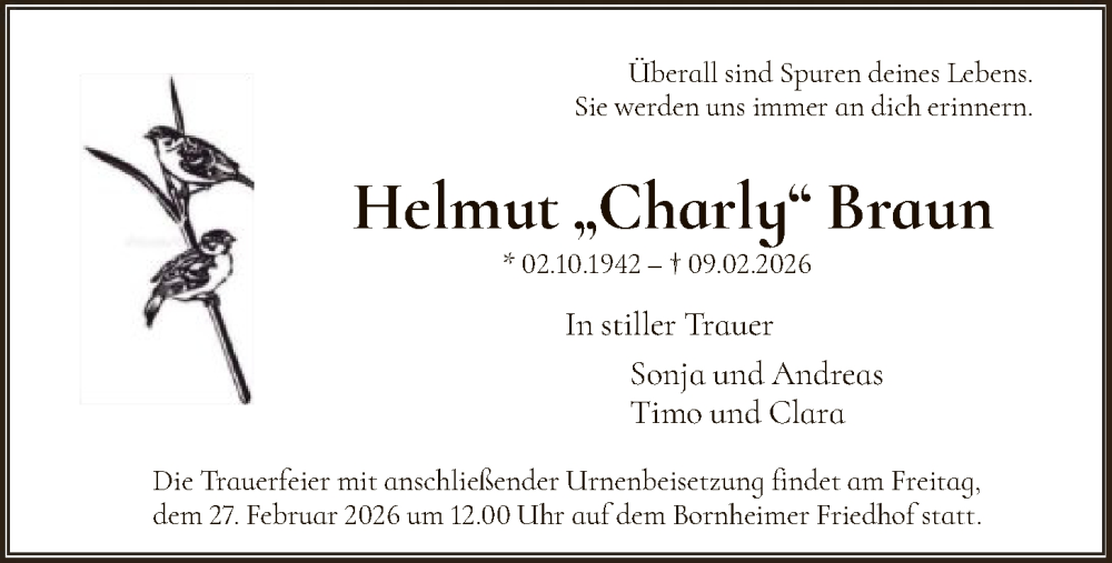 Hier finden Sie alle Traueranzeigen aus der Zeitung, die bisher für Helmut Braun erschienen sind. Weitere Traueranzeigen, die in der Zeitung erscheinen, werden hier ebenfalls aufgelistet