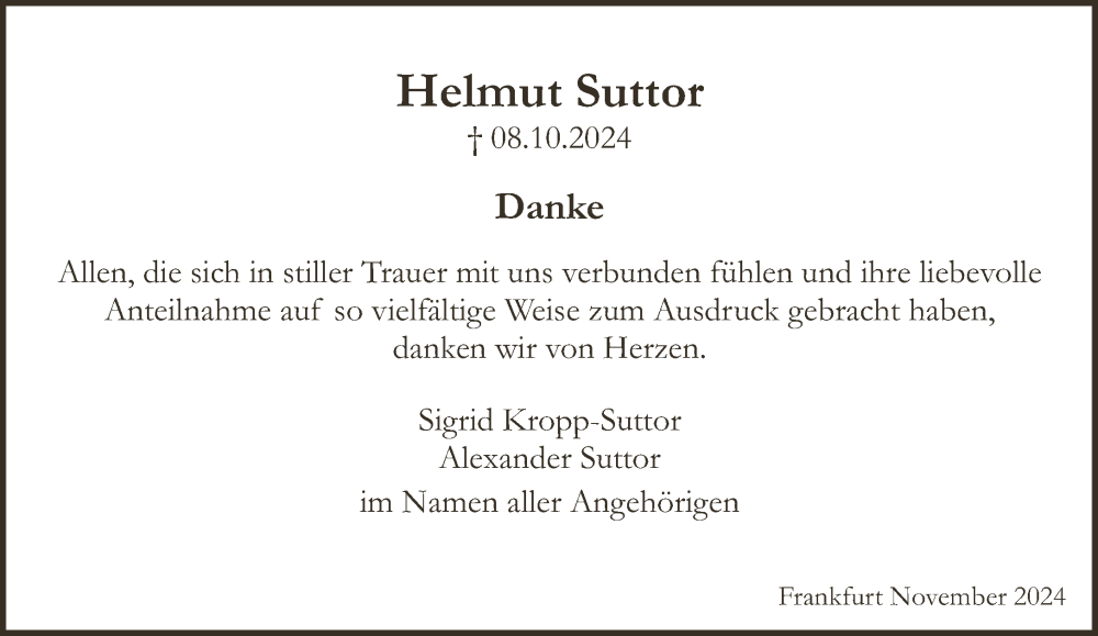 Hier finden Sie alle Traueranzeigen aus der Zeitung, die bisher für Helmut Suttor erschienen sind. Weitere Traueranzeigen, die in der Zeitung erscheinen, werden hier ebenfalls aufgelistet