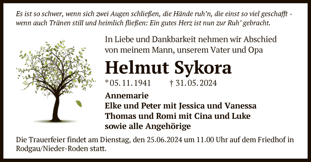 Hier finden Sie alle Traueranzeigen aus der Zeitung, die bisher für Helmut Sykora erschienen sind. Weitere Traueranzeigen, die in der Zeitung erscheinen, werden hier ebenfalls aufgelistet
