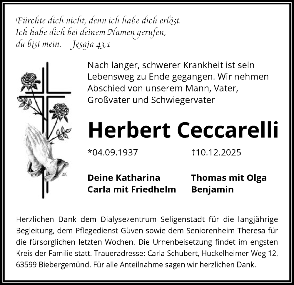 Hier finden Sie alle Traueranzeigen aus der Zeitung, die bisher für Herbert Ceccarelli erschienen sind. Weitere Traueranzeigen, die in der Zeitung erscheinen, werden hier ebenfalls aufgelistet