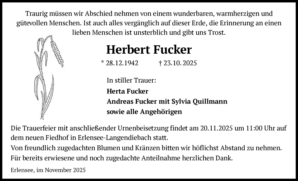 Hier finden Sie alle Traueranzeigen aus der Zeitung, die bisher für Herbert Fucker erschienen sind. Weitere Traueranzeigen, die in der Zeitung erscheinen, werden hier ebenfalls aufgelistet