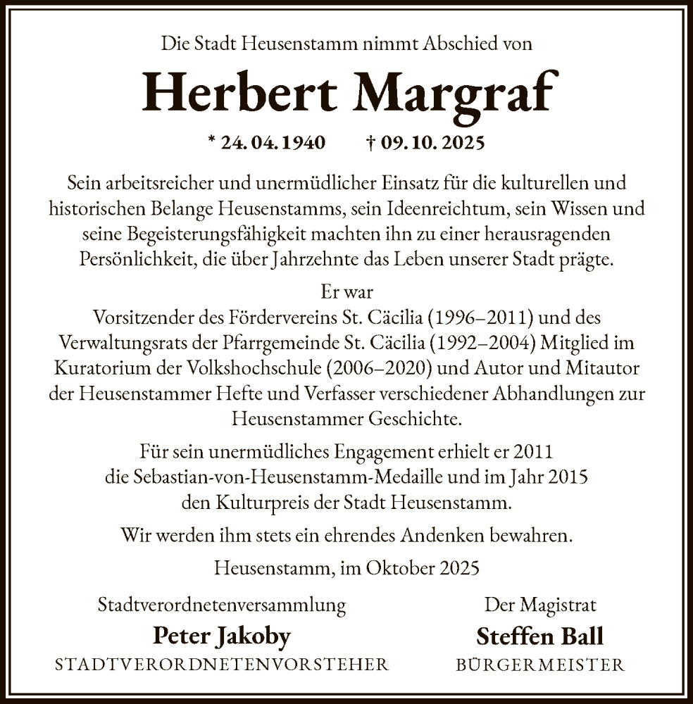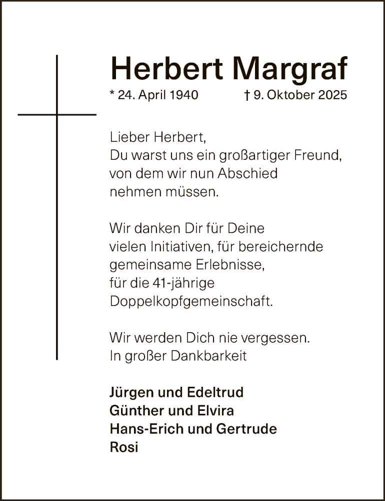 Hier finden Sie alle Traueranzeigen aus der Zeitung, die bisher für Herbert Margraf erschienen sind. Weitere Traueranzeigen, die in der Zeitung erscheinen, werden hier ebenfalls aufgelistet