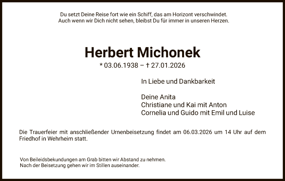 Hier finden Sie alle Traueranzeigen aus der Zeitung, die bisher für Herbert Michonek erschienen sind. Weitere Traueranzeigen, die in der Zeitung erscheinen, werden hier ebenfalls aufgelistet
