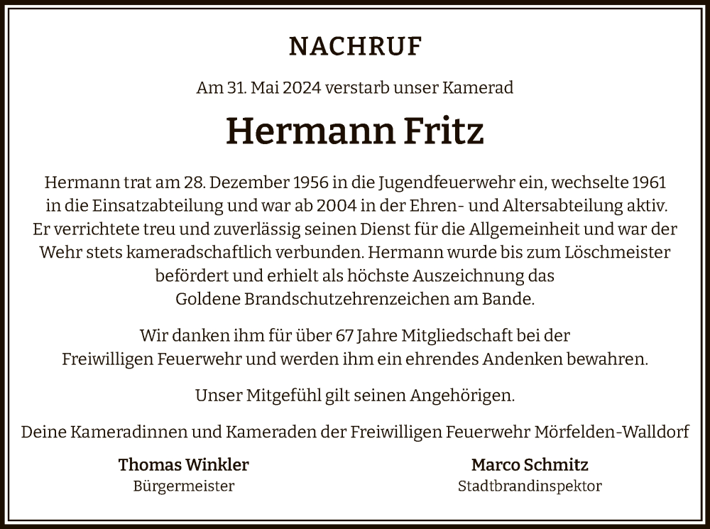 Hier finden Sie alle Traueranzeigen aus der Zeitung, die bisher für Hermann Fritz erschienen sind. Weitere Traueranzeigen, die in der Zeitung erscheinen, werden hier ebenfalls aufgelistet